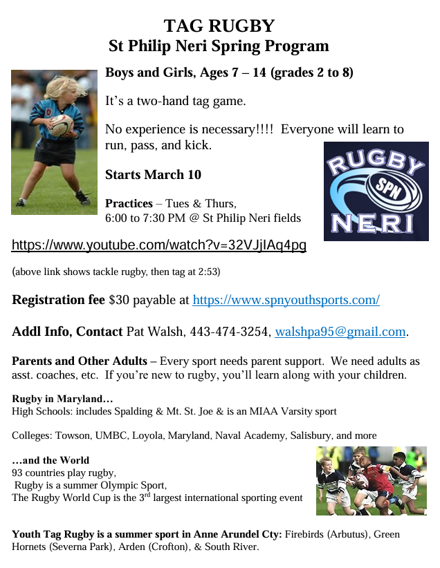 Players from 7 to 14 yrs of age (Grades 2 thru 8) are welcome. Practice starts March 10. Registration is required to practice or play. Questions about Tag Rugby may directed to Pat Walsh at [email protected]