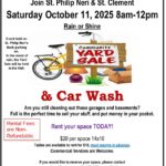 - 11SPN/SC Yard Sale and Car Wash8:00 am - 12:00 pmThe St. Philip Neri Parish Outreach Ministry and Youth Ministry are sponsoring a YARD SALE and CAR WASH! Come get your treasures and get your car washed! CAR WASH AND YARD SALE FLYER OUTREACH MINISTRY CONTACT: Virginia Grimm (410) 859-0571 ex. 16101 [email protected] YOUTH MINISTRY CONTACT: Matteo (443-831-1127) mat , ...