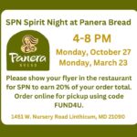 - 27Spirit Night at Panera Bread from 4-8 PM4:00 pm - 8:00 pmPlease join us for this Spirit Night at Panera Bread from 4-8 PM. Please show the fundraiser flyer to your server or mention the fundraiser. FLYER – Panera Bread Flyer Order online for pickup using the code FUND4U or show the flyer in the restaurant for SPN to earn 20% of your order. Panera Bread 1451 W Nursery R , ...