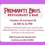 - 15Spirit Night at Primanti Bros from 11 AM to 11 PM11:00 am - 11:00 pmPlease join us for this Spirit Night at Primanti Bros from 11 AM to 11 PM. SPN earns 20% back when you use the code DINE2DONATE for online orders or by showing the flyer (see below) in the restaurant. FLYER – SPN SPIRIT NIGHT AT PRIMANTI BROS. Primanti Bros. 996 Corporate Blvd. Linthicum Heights, MD 21090 If you , ...