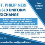 - 7Used Uniform Exchange from 3-5 PM3:00 pm - 5:00 pmFrom October to June on the first Tuesday of the month we will be hosting a USED UNIFORM EXCHANGE. This event is sponsored by the Home and School Association. The location is in the SPN BASEMENT. Please use the front school doors to enter this exchange. Want to make sure an item you are looking for is in stock or have , ...