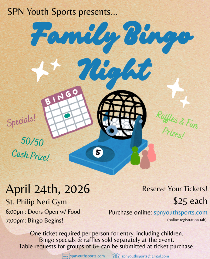NEW this year! The SPN Youth Sports program is sponsoring a FAMILY BINGO night.