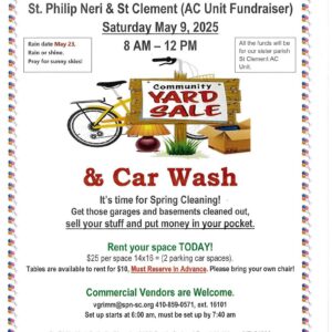 Spring Yard Sale and Car Wash The St. Philip Neri Parish Youth Ministry and Outreach Ministry ... 09 May All Day St. Philip Neri Back Parking Lot