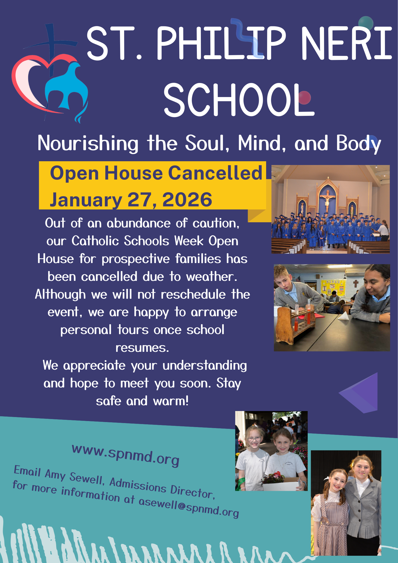 The Open House for prospective families has been canceled and will not be rescheduled. We are happy to arrange personal tours once school resumes, if you have any friends or family that were planning to attend. Please have them email Ms. Amy Sewell, Admissions Director, at [email protected] for more information and to schedule a tour.